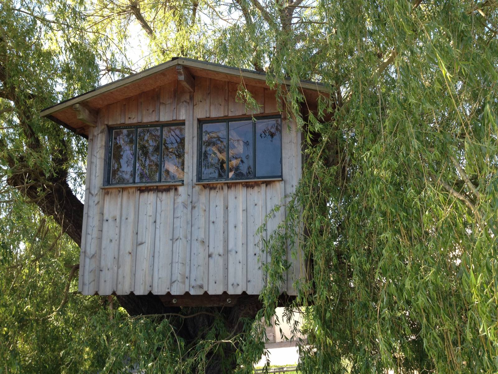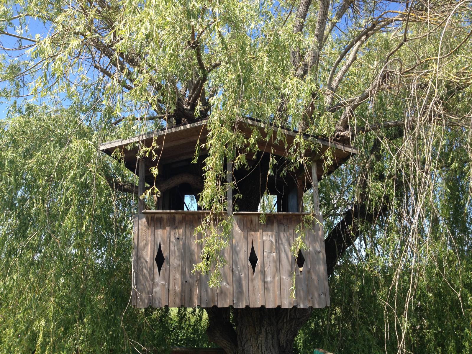 cabane d'enfant perchée dans un arbre, en l'occurrence un saule pleureur.