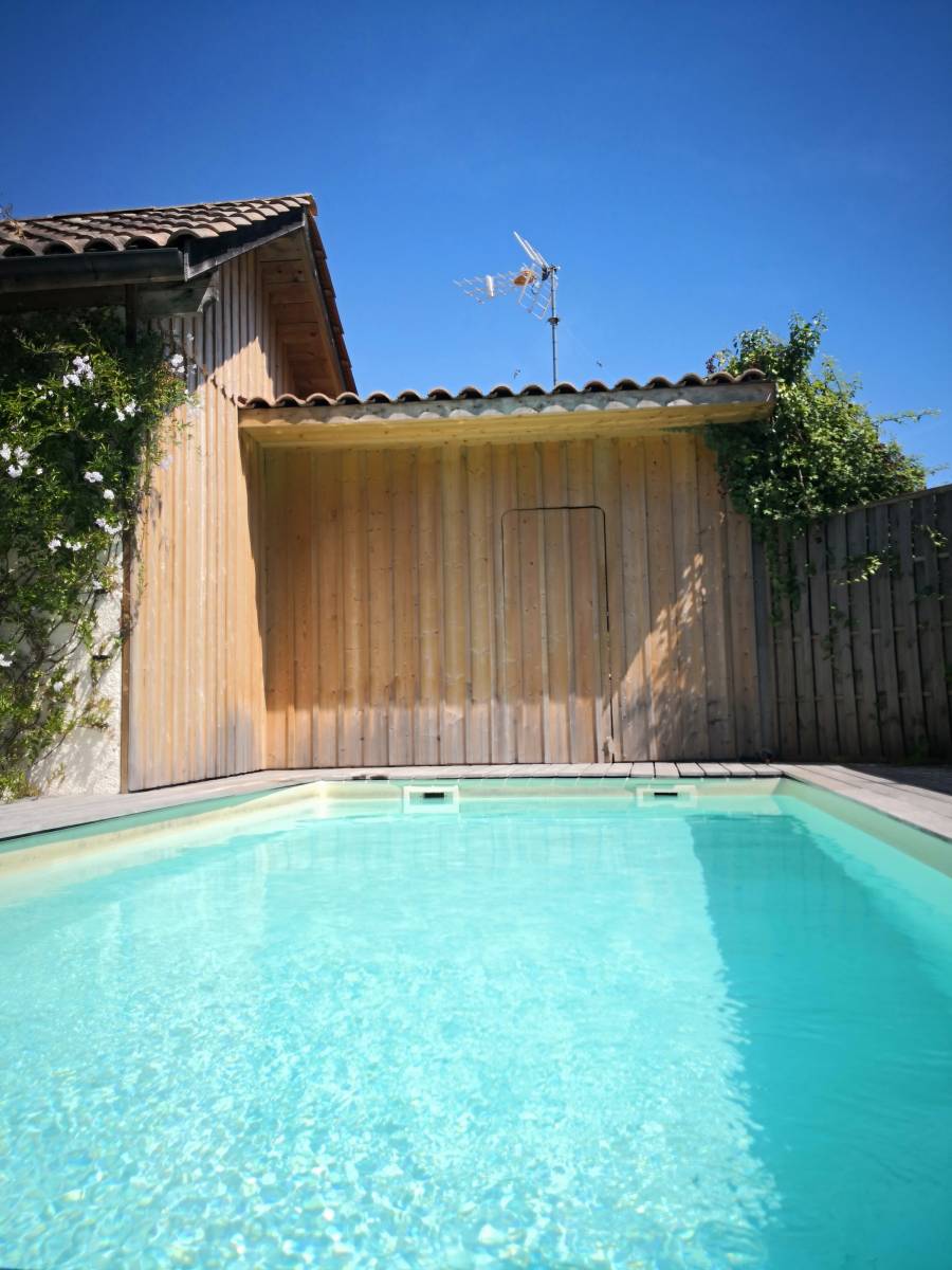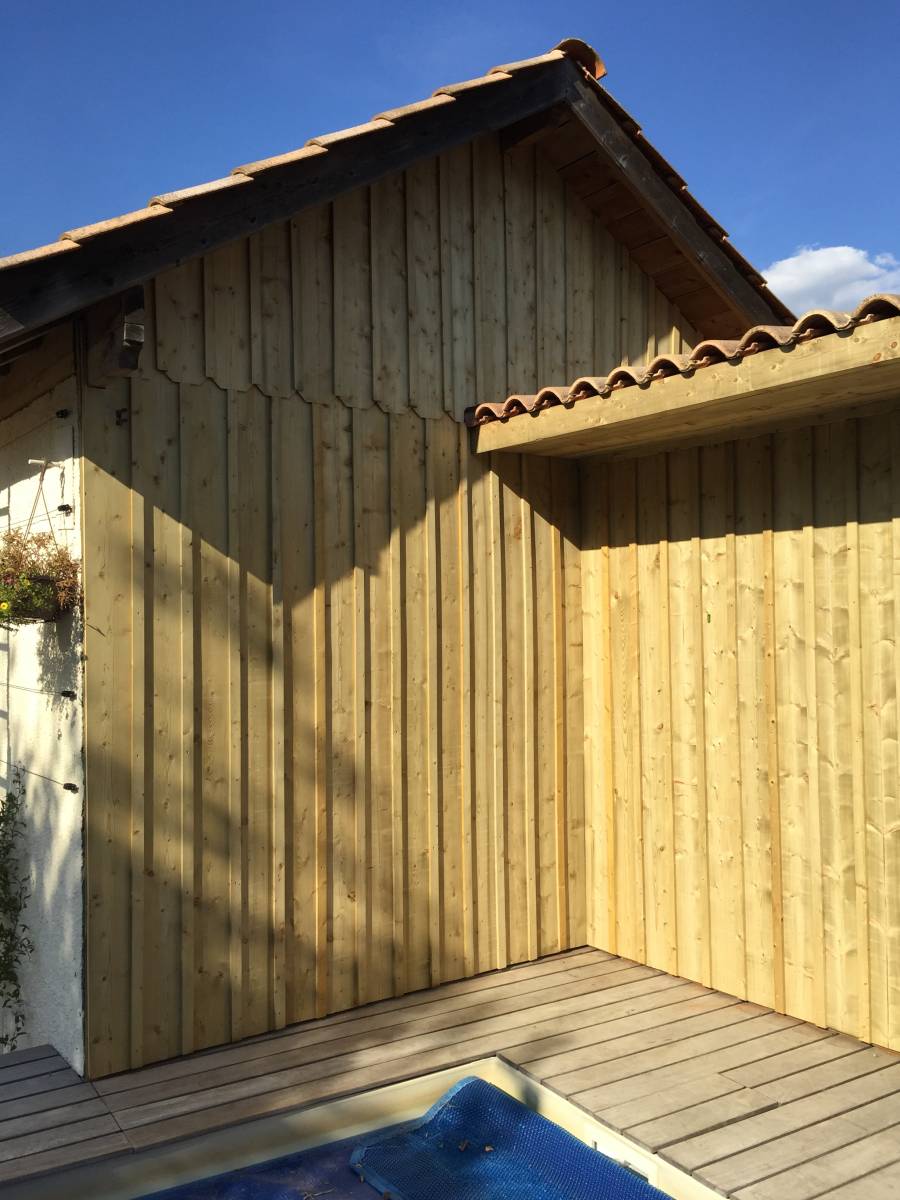 L'entreprise Laflaquiere a réalisé un mur en ossature bois afin d'habiller une grange donnant vue sur la piscine.