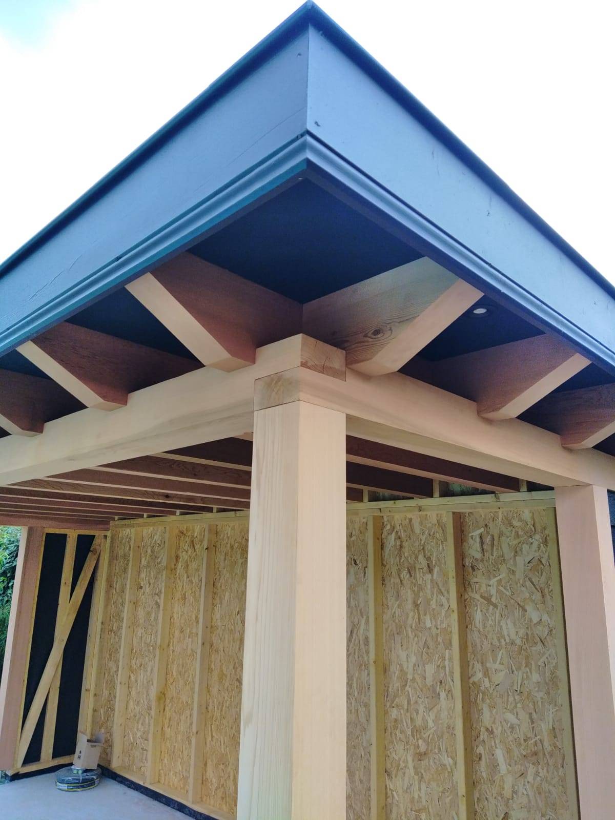 Nous sommes ensuite intervenu pour mettre en place les murs en ossature bois, le portique et les solives en Red Cedar.