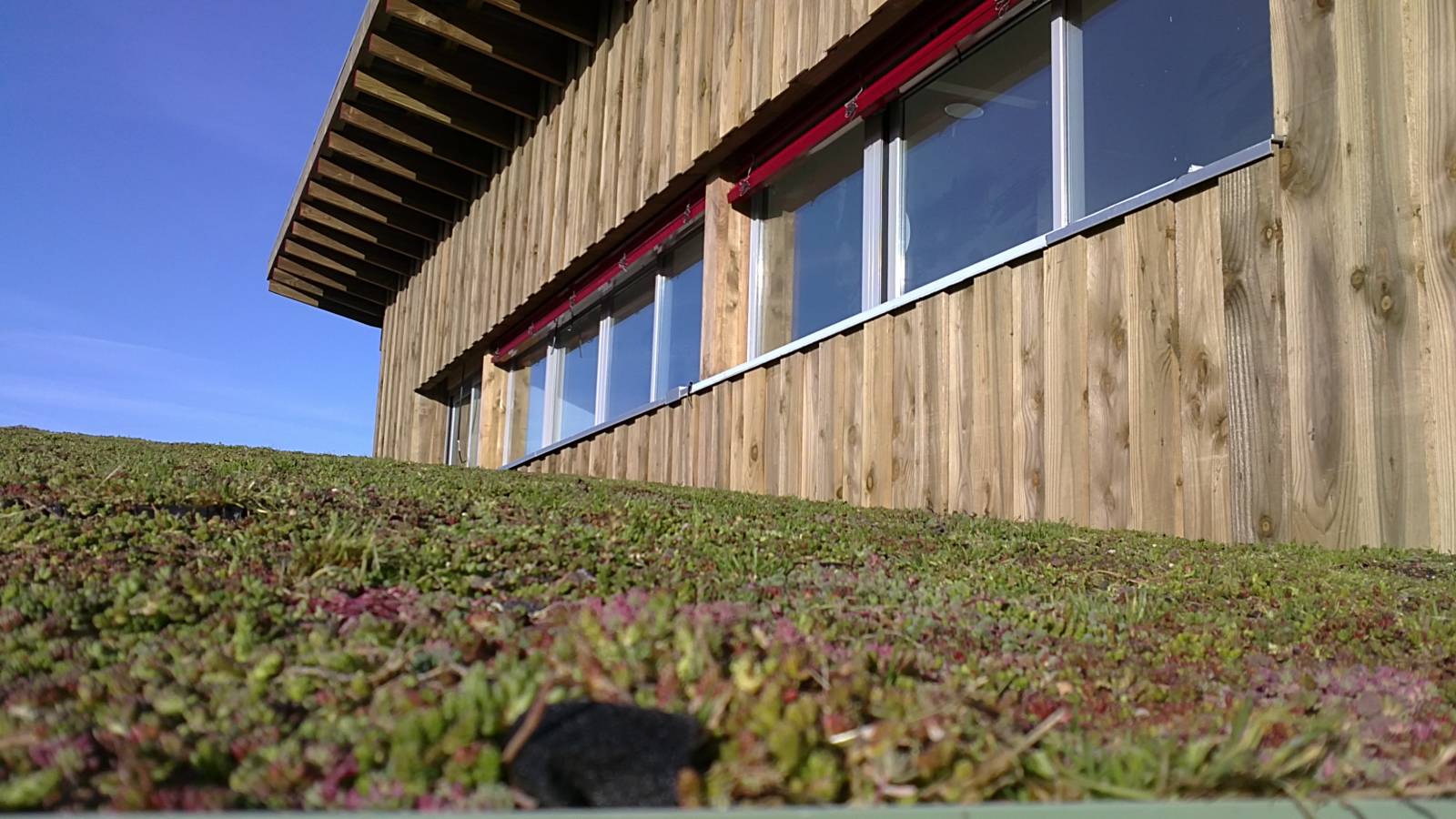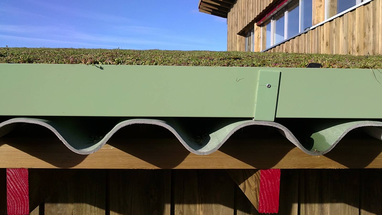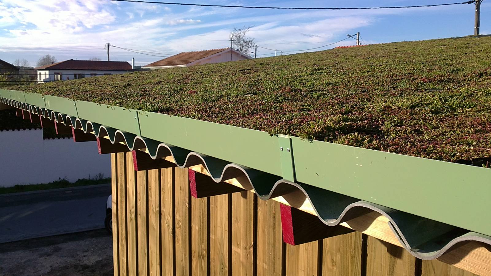 Cette toiture est constituée de plants de sedum disposés dans des bacs disposés sur des plaques ondulées.