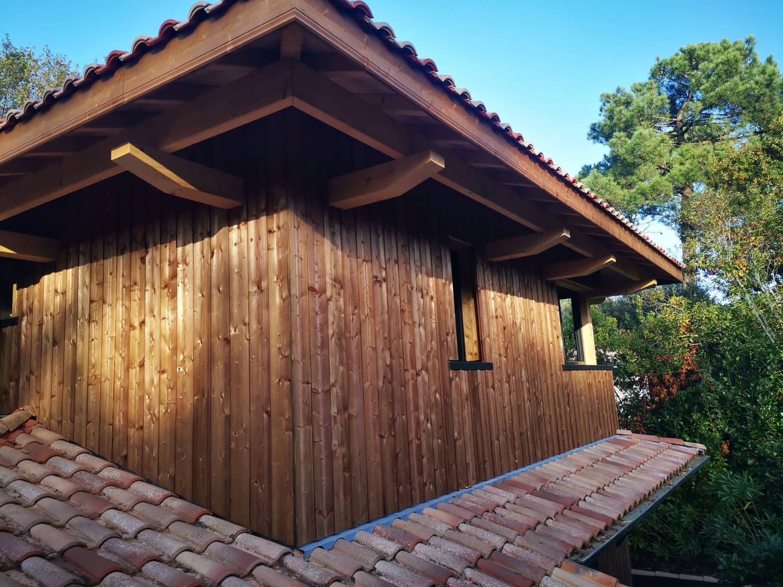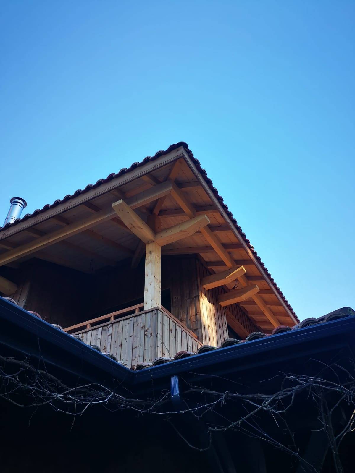 Les bandeaux en bois autoclave marron ajoutent une finition soignée, tout en étant parfaitement adaptés aux conditions climatiques locales. Côté praticité, les évacuations d’eaux pluviales en zinc assurent un drainage efficace et esthétique. Enfin, la couverture en tuile romane allie tradition et modernité, offrant une toiture robuste et pérenne.